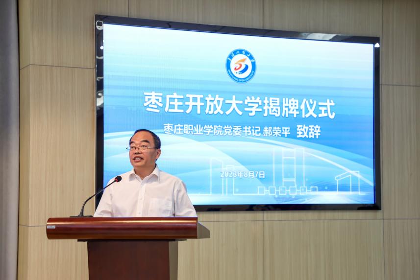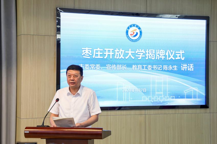 陈永生在讲话中表示,枣庄开放大学的揭牌,标志着枣庄职业教育和开放教育进入了新的发展阶段,市委、市政府将一如既往地关心支持开放大学发展,努力为开放大学深化改革建设发展提供有利条件和坚强保障。他强调,一要坚持党管教育。坚持和完善党委领导下的校长负责制,坚持社会主义办学方向,以立德树人为根本任务,以党的创新理论凝心聚魂,教育引领广大师生坚定拥护“两个确立”、坚决做到“两个维护”。二要完善办学体系。大力开展非学历教育,拓宽技术技能人才成长通道,坚持开放办学,创新“互联网+教育”模式,推动学分银行建设,不断向基层延伸学习网点,搭建全民终身学习的公共服务平台。三要提升教育质量。坚持引育并重,加强教学名师和业务管理骨干引进培养,打造一支业务精湛、结构合理、特色鲜明的“双师型”人才队伍。健全质量保障体系,加强教学过程的评价和管理,提高办学质量效益,为“强工兴产、转型突围”贡献更多人才力量。