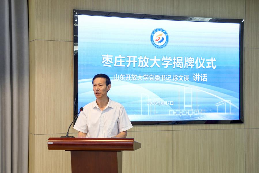 徐文谋在讲话中指出,依托枣庄职业学院融合组建枣庄开放大学,是落实《山东开放大学综合改革方案》的切实举措,也是全省教育改革的一项重要成果。就枣庄开放大学的建设发展,他强调,一是提高政治站位,全面落实立德树人根本任务。要深入学习贯彻党的二十大精神,全面贯彻落实习近平总书记关于教育的重要论述,紧密围绕服务国家和区域发展需求,坚持终身教育的发展理念,创新开展学历教育和非学历教育,建设成为方式更加灵活、资源更加丰富、学习更加便捷的新型高等学校。二是着眼社会需求,多措并举服务全民终身学习。要按照“构建服务全民终身学习的教育体系”总目标,紧密对接地方产业,面向基层干部群众、新型职业农民开展学历教育和技能培训,满足广大群众多元化的学习需求,不断地提高国民素质和人民生活品质。三是立足特色发展,落实落细教育改革工作要求。枣庄开放大学要借揭牌成立的契机打开建设与发展新局面,坚持创新发展理念,加快推进落实综合改革方案所要求的各项改革任务。