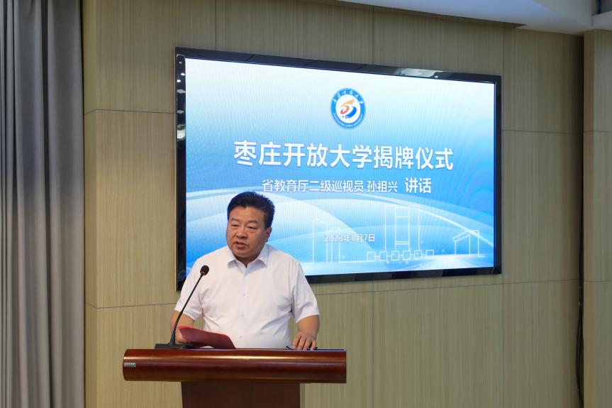 孙祖兴在讲话中指出,枣庄职业学院认真贯彻党的教育方针,坚持正确的办学方向和开放的办学理念,不断拼搏进取、开拓创新,为构建服务全民终身学习的教育体系,促进枣庄乃至全省经济社会发展做出了重要贡献。就办好开放大学,他强调,一是要坚持党的领导,为党育人、为国育才。加强党对学校工作的全面领导,坚持立德树人根本任务,把培育和践行社会主义核心价值观融入办学治校、教书育人全过程,建设协同高效的大思政格局。二是要突出改革创新,探索发展模式路径。要以深化改革整体推进转型发展,面向企业、城乡社区寻求办学空间,加大开放力度,激发内生动力。三是要强化提质增效,加速推进转型发展。要抓住线上教育快速发展的重大机遇,利用好信息化技术手段,改进教育教学,不断创新教育服务供给,推动开放教育向职业能力提升转型。要积极探索继续教育与普通教育、职业教育融合发展的机制,成为终身学习“立交桥”的重要支撑。