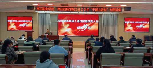 为进一步推动校企合作,深化产教融合,助推职教高质量发展,11月15日,在学院一楼学术报告厅,枣庄职业学院副院长张蓝兮以《让产教融合、校企合作成为助推职业教育高质量发展的动力引擎》为题,开展“干部上讲台”专题讲堂活动,各系院分管领导、校企合作负责人及校企合作与科研处全体人员参加讲座。