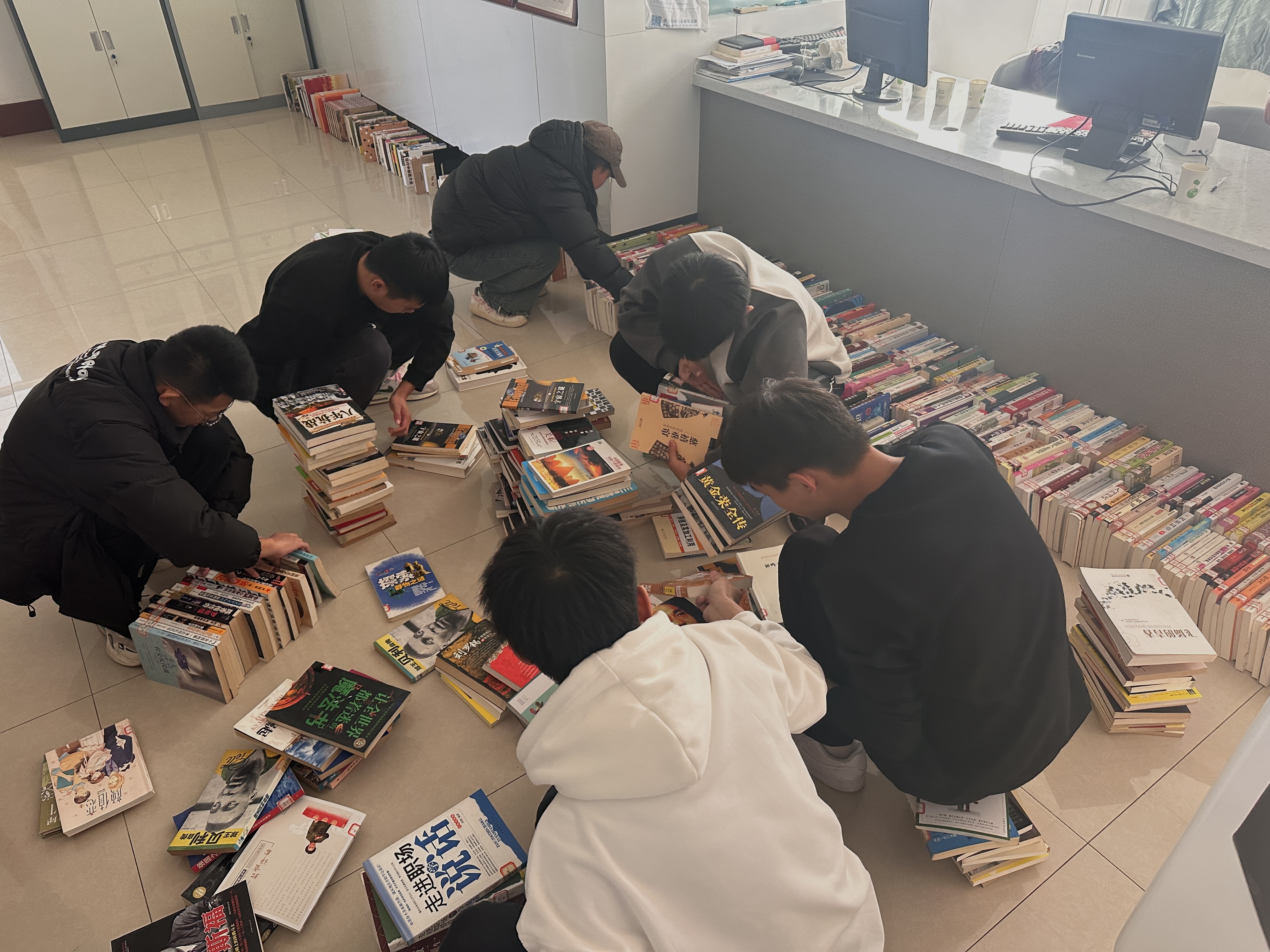 院学生会学生干部搬运图书,在教师指导下上架图书