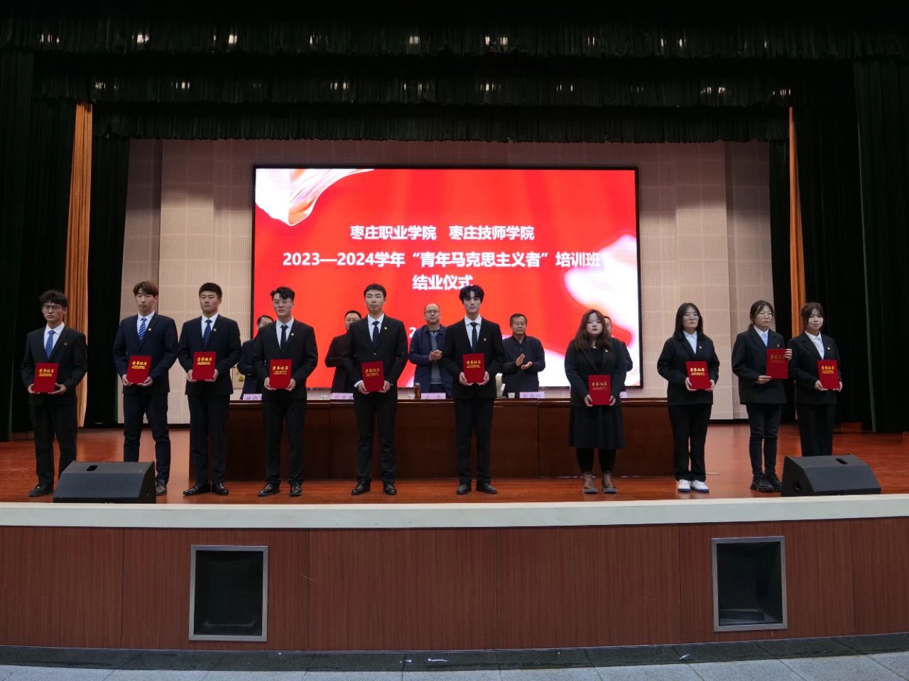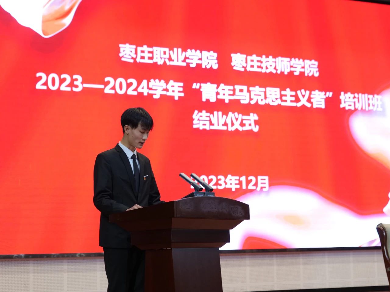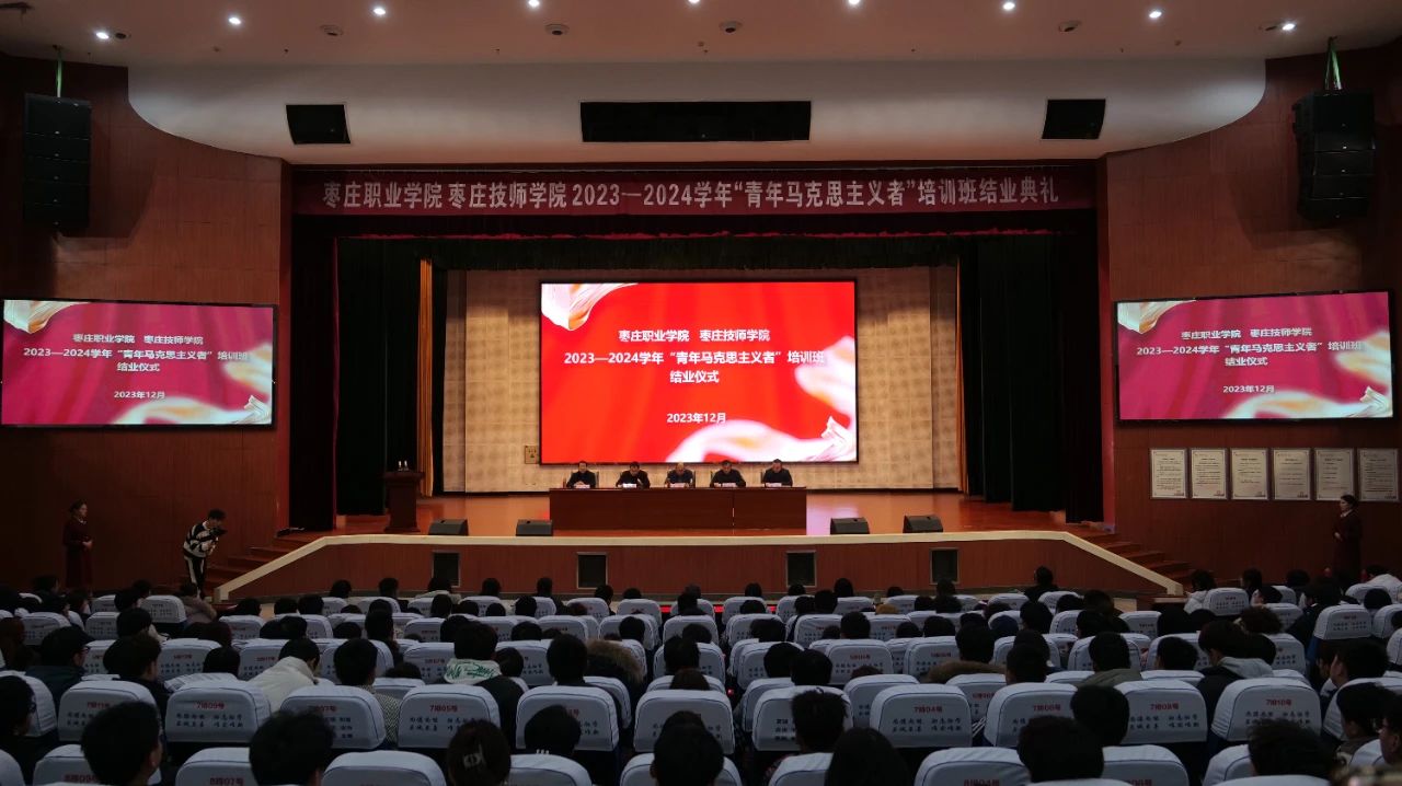 为深入学习贯彻习近平新时代中国特色社会主义思想和党的二十大精神,深入实施“青年马克思主义者培养工程”,落实我院分类别、分层次培养学生骨干的目标,学院于12月1日在信息楼礼堂举办2023-2024学年青年马克思主义者培训班结业仪式。枣庄职业学院党委委员、副院长王念,学生工作处(团委)相关同志、各系(院)负责学生工作的相关同志及参训学员共计500余人参加了本次结业仪式。