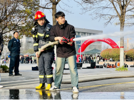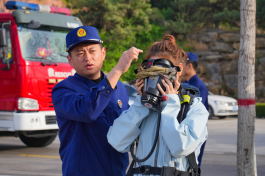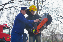 演练顺利完成后,学院师生在消防救援人员的引导下近距离参观消防车和各类破拆、救生、防护装备器材、试穿战斗服、背负空气呼吸器,体验灭火器灭火、消防车出水灭火。