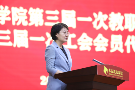 闫羲和代表市总工会向大会的召开表示热烈的祝贺。她强调,一要坚持党的领导,牢牢把握工会工作正确政治方向。着力加强教职工思想政治引领工作,推动重要思想、重要论述走进教职工心里,确保正确的政治方向和价值导向贯穿到学院育人育才的全过程。二要主动担当作为,引导教职工在推动高质量发展中建功立业。充分发挥“枣庄工匠学院”作用,加大“工匠进校园、学生进企业”力度,主动参与实施全市“未来工匠”培育计划,源源不断的为枣庄发展输送高技能人才。三要认真履职尽责,努力提升教职工的获得感、幸福感。要落实平等协商、民主管理等制度机制,推动学院与教职工形成利益共同体、事业共同体,不断增强教职工的归属感,让人才愿意来、留得住、能出彩。