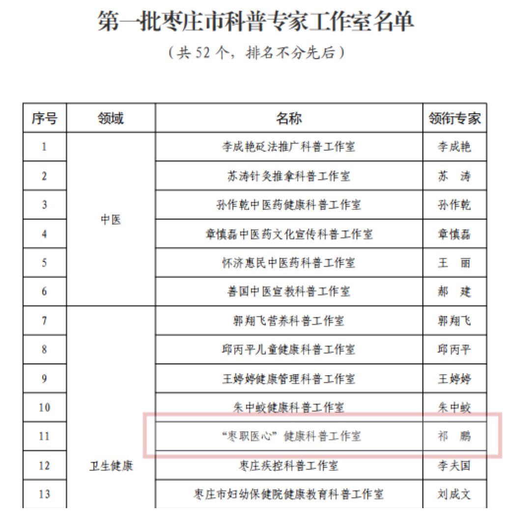近日,枣庄市科学技术协会发布《关于公布第一批枣庄市科普专家工作室的通知》,我院医学院“枣职医心”健康科普工作室成功入选。