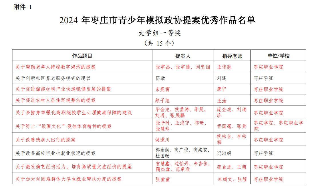 经初评、评审会终审、社会公示等环节,枣庄职业学院提交的《关于帮助老年人跨越数字鸿沟的提案》等11个作品荣获一等奖;《关于保障延迟退休人员基本权益的提案》等29个作品荣获二等奖;《关于搭建多元化平台 助力乡村振兴的提案》等32个作品荣获三等奖;枣庄职业学院荣获优秀组织单位。
